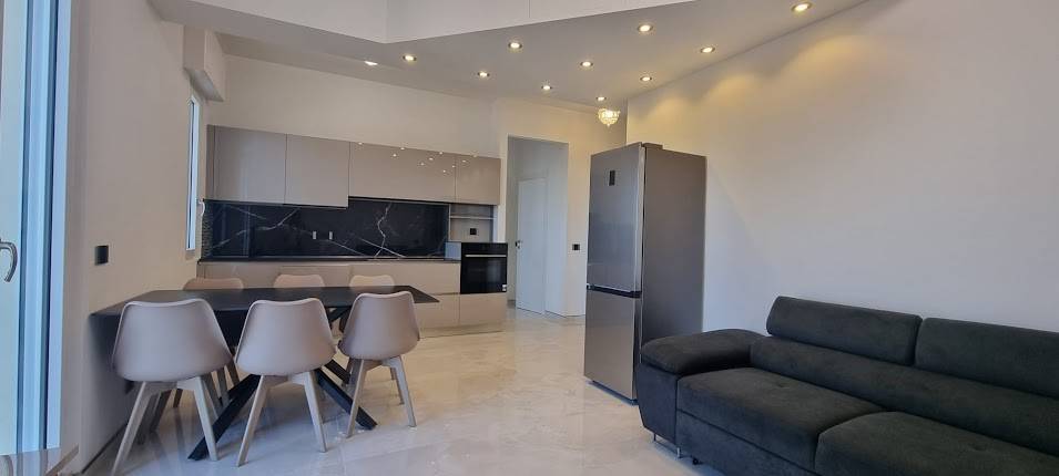 E' composto da ampio soggiorno con cucina a vista e balcone, bagno, due camere, dispensa e lavanderia.